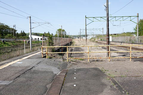 | 旧上り1番のりば中程より、旧上り本線跡と下り新白河・郡山・福島方面を見る。 現在は線路が撤去されているが、駅開業時は上り本線が敷設されていた。 また、右側の現上り1番線は貨物側線で旅客ホームはなかった。 その後、特急・急行など優等列車の増発により、1969年(昭和44年)11月に 駅の配線が見直され、当上り本線が上り副本線・停車線扱いに、 右側の貨物側線が上り本線・通過線に改修された。 1982年(昭和57年)に東北新幹線が開業し、優等列車が大幅に削減されると、 当ホームの上り停車線は撤去され、右側の上り通過線に単式ホームが設置された。 単式ホームは桁式が採用されているが、ホーム先は盛土式ホームとなっている。 これは旧貨物ホームを部分的に改修・利用したものと推測する。 |