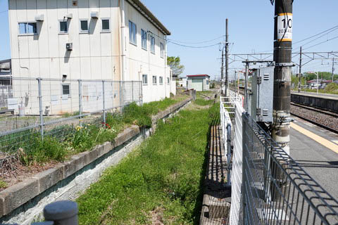 | 下り1番のりば脇より旧貨物ホームと下り郡山・福島方面を見る。 旧貨物側線(横取り線?)は長らく使用されていないと思われ、草に埋もれてしまっている。 |