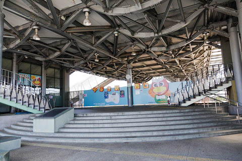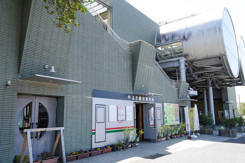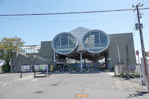 駅舎(東口)。 丸窓の出っ張っている部分にはエレベーターが設置されている。 出入口階段は右端で、中央部はトイレになっている。 |