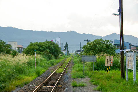 | ホーム西端(西米沢寄り)から、上り米沢方面を見る。 線路右手には1線分の路盤が確保されているが、交換設備または待避線跡であろうか? 1976年(昭和51年)10月の航空写真には、現在と同じ1面1線の姿が映っており、 それ以前の航空写真は解像度が粗く確認不能である。 また手元の資料も乏しいため、 右側路盤の線路敷設およびホームの有無については詳細不明。 |