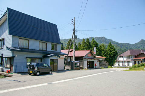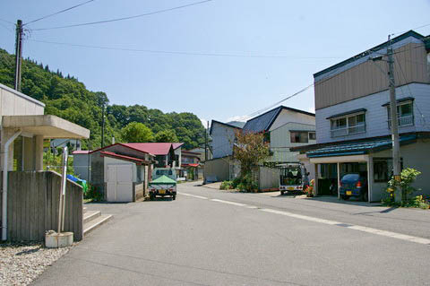 | 駅舎前より南側を見る。 左手が駅舎である。 駅前は広場になっているためスペースがあるが、集落のメインストリートは道幅が狭い。 |