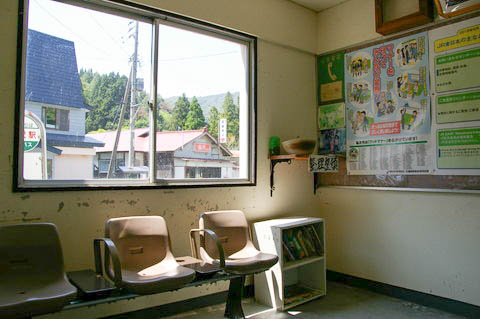 | 駅舎入口左手にある待合室の様子。 室内は狭く、ベンチも3席のみである。 |