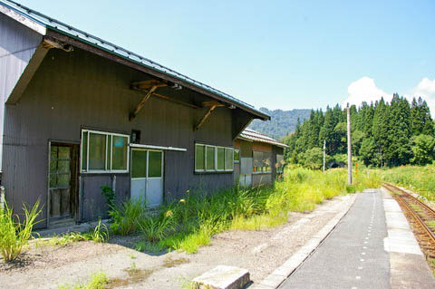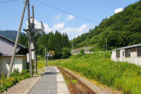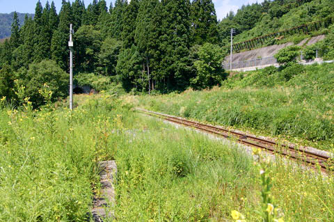| ホーム南端(手ノ子寄り)から、下り坂町方面を見る。 廃止時期は不詳であるが、かつては線路右手の草地には上り本線と盛土式ホームがあった。 写真右手に写っている建物は保線車両用の格納庫と危険物貯蔵庫で、 草に埋もれて現在も横取り線が通じている。 |