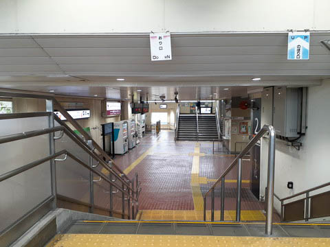 | 下り2番のりばへの階段(踊り場)より、構内コンコースを見る。 正面に1番のりばへの階段、階段左手奥にエレベーター、エスカレーターがあり、 階段に並行してエスカレーターの設置がない変則的な配置となっている。 改札口は階段下右手。 |