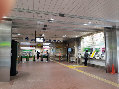 | 改札口付近の様子。 写真左端にトイレが見える。 右側の ”みどりの窓口” 跡には ”乗車駅証明書発行機” が設置されている。 見えないが 改札内には ”乗り越し精算機” がある。 駅員不在の時間帯が設定されており、窓口が閉まっている場合がある。 |