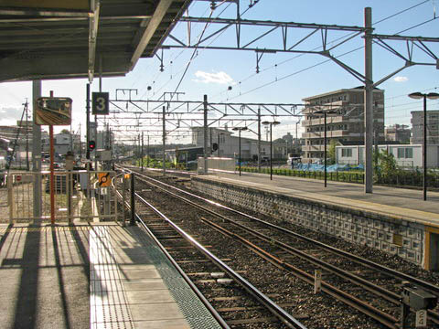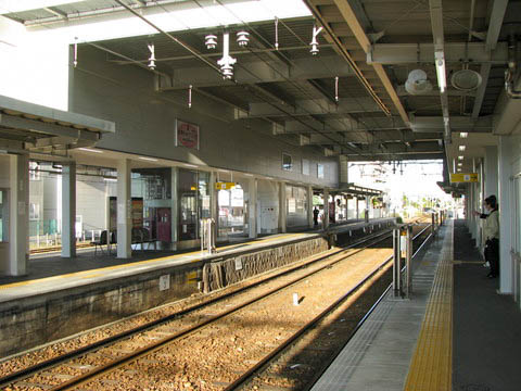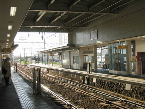 | 上り3番のりば北寄り(上挙母寄り)から、下り豊田市・猿投方面(北側)を見る。 橋上駅舎化以前は、このホーム先に構内踏切を有していた。 当駅は左の島式ホームが1・2番のりば、当単式ホームが3番のりばとなっている。 橋上駅舎化に伴い、旧来からののりば番号を逆に付番し直したとのこと。 |