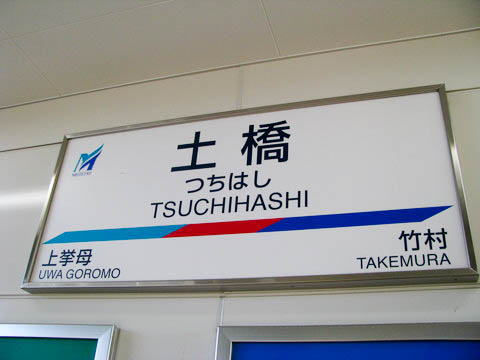 | 壁面用駅名標。 駅名は開業時の地名である 『挙母町大字土橋』 に由来する。 1889年(明治22年)10月の町村制施行以前の当地は、『西加茂郡土橋村』 であった。 |