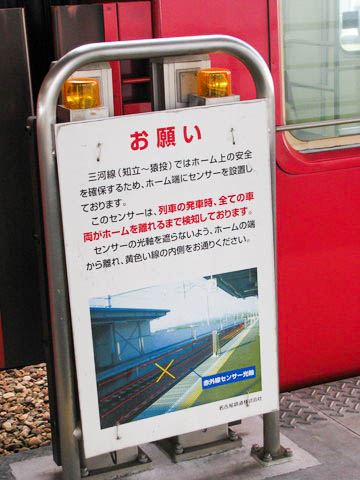 の注意書き。 当駅には赤外線を使用した障害物検知装置が設置されており、 駅利用者が検知されないよう書かれている。 |