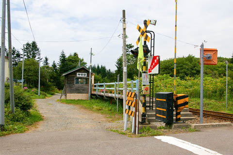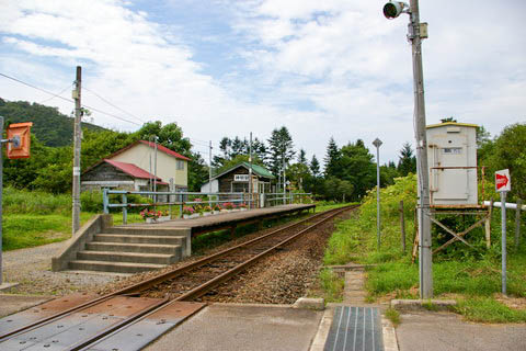 全景。 奥に見える木造の建物は地表から建てられているが、 道路に接する出入口はなく、ホーム側に出入口のある待合室である。 尚、正面に延びる非舗装路は80m程先の民家にて行き止まっている。 上り江差方面を見る。 |
