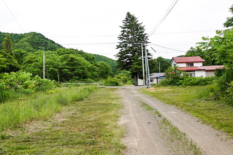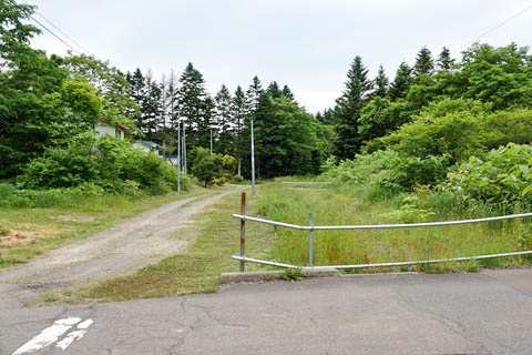 駅跡。 神明駅の構内扱いであった 『御料道路踏切』 跡から駅跡と上り江差方面を見る。 駅があった痕跡は殆ど残っていないが、フェンスとなっている単管パイプの支柱下に 踏切の縁石が残されている。(こんなもの誰が気が付くんだ?) 正面の非舗装路左手に民家があったと記憶するが、更地になっている。 |