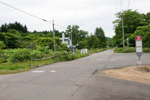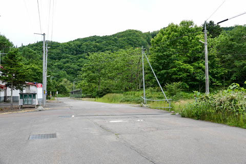 『神明ノ沢線』 にて、『御料道路踏切』 跡を見る。(西側を見る) 江差線の木古内-江差間の廃止により 『神明バス停』 は、 道道5号線沿いから旧駅前へ移設されている。 路線バスは道道5号より 『神明ノ沢線』 に入り、当停留所先に見える 転回場でUターンしていくようになった。 尚、神明集落の中心部は、この先900m程にある集会所の 『神明会館』 であるが 過疎化が進み現在同地区にはほとんど定住者がいない状態となっている。 かつては 『神明会館』 の西250m程に 『神明小中学校』 があったが、 児童数減少により 1977年(昭和52年)3月末を持って閉校している。 児童数のピークは神明駅が開業した頃の 1950年代後半〜1960年代前半で 開拓者の入植により 1959年(昭和34年)に73人の児童が在籍したが 山間開拓による限界から離農が進み、1960年代後半〜1970年代にかけて 急速に児童数が減少し廃校に至っている。 神明駅跡は道路左手。 |