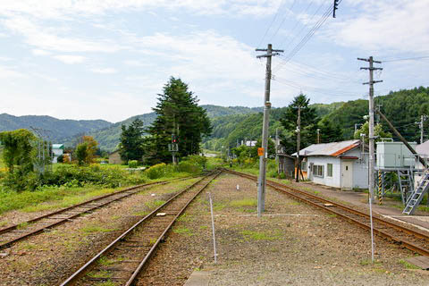| 上り2番のりば西寄り(宮越寄り)から、下り木古内・函館方面を見る。 右手に側線が1線ある。(かつては2線の側線を有したようだ) また写っていないが、駅舎のある右手には古い貨物ホームが残っている。 木材産業が盛んで、ベニヤ材や薪、木材などが貨車に積み込まれたとのこと。 |