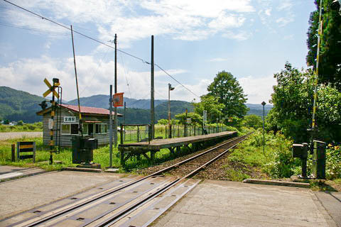 全景。 桁式ホームと、ホーム出入口階段前に木造駅舎(待合室)を配置した駅である。 初代駅舎はプレハブの小屋であり、1986年(昭和61年)頃に他駅から 現駅舎(待合所)を移設設置したとのことだが、詳細は不明。 |