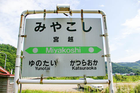 当駅は上ノ国村字早瀬に開業したが、駅名は 『早瀬』 とはならず、 駅の南側を流れる 『天の川』 対岸の上ノ国村字宮越から、その字名が採用されている。 これは周辺で最も名の知れた大きな集落が 『宮越』 であり、また駅の最寄りが宮越地区で あったために地域住民の心情や利用をを見込んで命名されたものである。 昔の当地は立派な松の木が生えていたことから、『松ノ木』 という地名であった。 これは現在でも駅に隣接する 『松の木道路踏切』 にその名を残している。 また、宮越の地名由来には諸説あり、木古内への道の途中の丘の上に霊験あらたかな 神社があり、『宮を越えて行く』 こと から 『宮越』 という説と、 アイヌ語のイーヤムウシナイ(栗の木の多い沢)が 『ミヤコシ』 に訛り、 それに漢字を当てたという説があるとのこと。 |