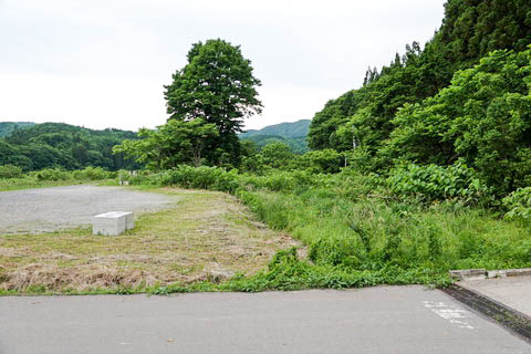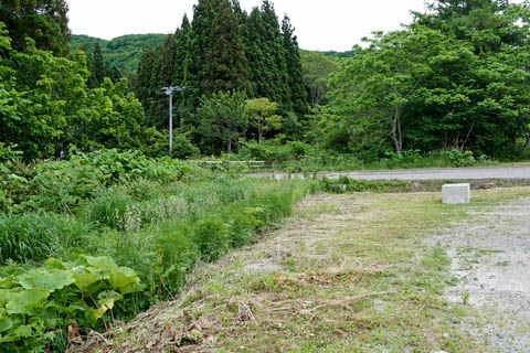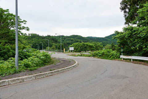 駅跡。 『松の木道路踏切』 跡南側から駅跡と上り江差方面を見る。 正確な位置関係はわからなくなっているが、往時の写真と比較すると 写真右端の道路側溝(黒い蓋の部分)の延長上右側の藪の部分がホームと路盤跡、 草が刈られている部分が駅舎跡、左側の非舗装部分が駅前広場跡である。 |