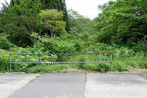 跡から、下り木古内・函館方面を見る。 踏切の線路跡部分のみ別舗装され、路盤の痕跡が明確になっている。 路盤跡はフェンスで立入が制限されているが藪化が進み、立ち入れる状態にない。 藪になった路盤にバラストが残されているのが見える。 |