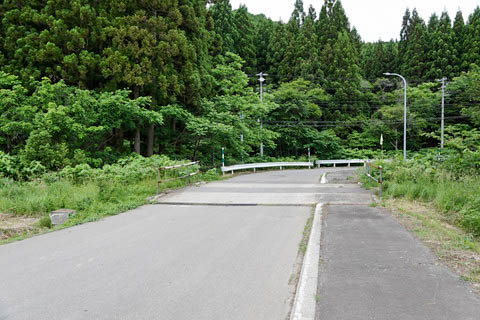 跡南側から、踏切跡(北側)を見る。 この先100m程で、北海道道5号江差木古内線に突き当たる。 道道まで民家は無く、道道沿いにもほとんど民家はない。 |