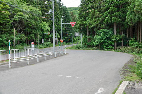 『宮越』 バス停前より、江差方面を見る。 左へ駅跡である。 |