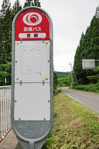 『江差木古内線』 の 『宮越』 停留所。 当バス停には、江差方面のバスが発着する。 木古内駅前行きは道路対面側に停車するが、停留所標識はここ1ヶ所のみとなっている。 江差線廃止に伴い、代替路線の 『江差木古内線』 が新しく開設されたことにより、 上ノ国町内各所にバス停が新設されているが、当停留所は旧駅前に移設されず 旧来からあるものをそのまま継続使用している。 |