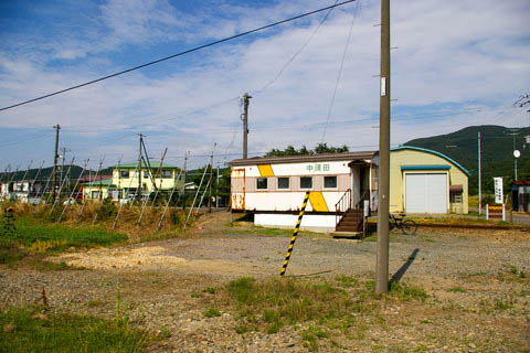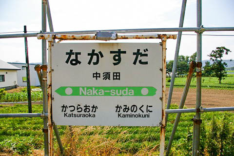 | 建植型駅名標。 駅名は開業時の地名である 『檜山郡上ノ国村字中須田』 より、字名が採用されている。 当地は旧来より上ノ国町(村)の一部であった。 昔は村内でも開拓が進んでいない地域であったが、1788年(天明8年)頃のニシンの 不漁をきっかけに、農業転換のための開拓が始まり、農村ができたとのこと。 尚、『中須田』 の地名由来は明確でないが、”須田”とは砂州にある田んぼ、 ”中”は須田地区の中心地からという説がある。 中下や中志田など変遷があったとも言われている。 |
