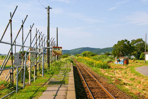 跡手前から、東側を見る。 駅跡および江差方面は左手(北側)、下り木古内、函館方面が右手(南側)になる。 |