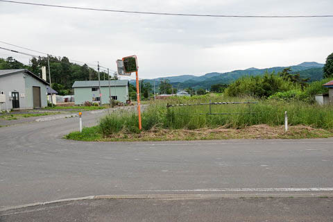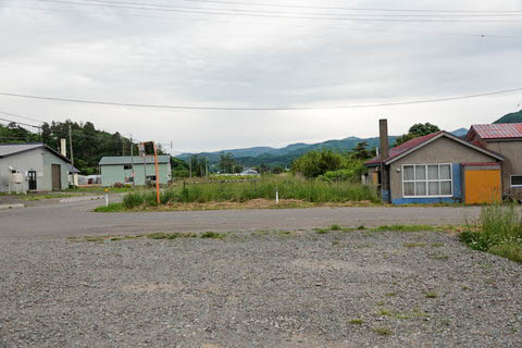 駅跡。 『勝山道路踏切』 跡から、上り江差方面を見る。 非舗装の駅前広場はほぼそのままであるが、 駅舎・ホーム跡には横山興業(株)の工事事務所 が建てられている。 |