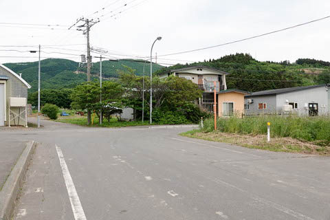 跡手前から、西側を見る。 駅跡および江差方面は右手(北側)、下り木古内、函館方面が左手(南側)になる。 道路左側の民家脇にある背の高い電柱にへばり付くように、 函館バスの 『豊田』 停留所がある。 |